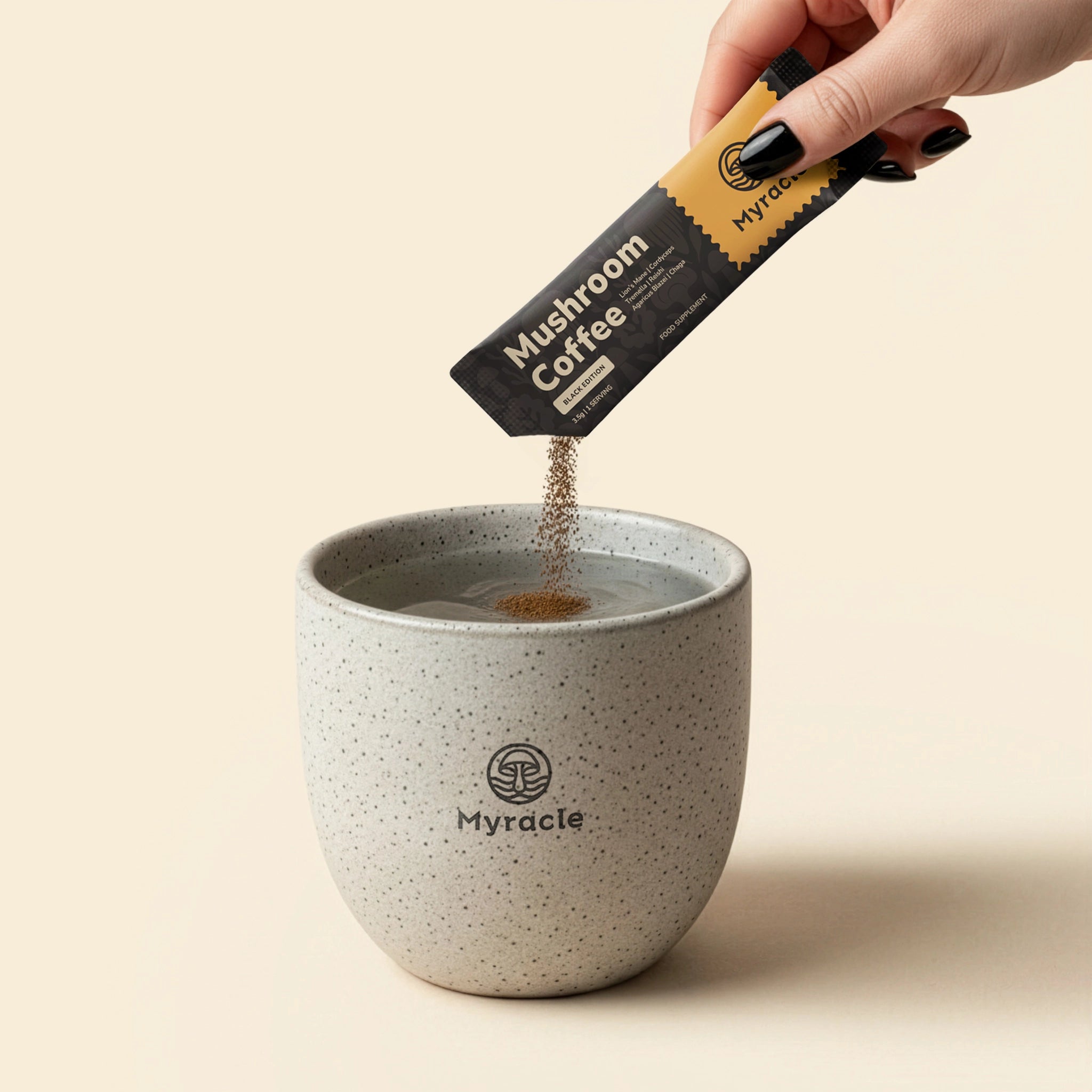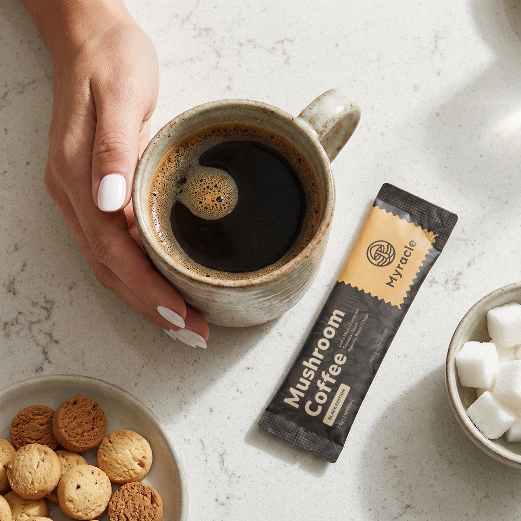 Myracle tastes just like a delicious, barista-style americano. We use a low-acidity coffee extract to bring out a rich and complex flavour profile, with smooth chocolatey and caramel notes, without any hint of mushrooms!