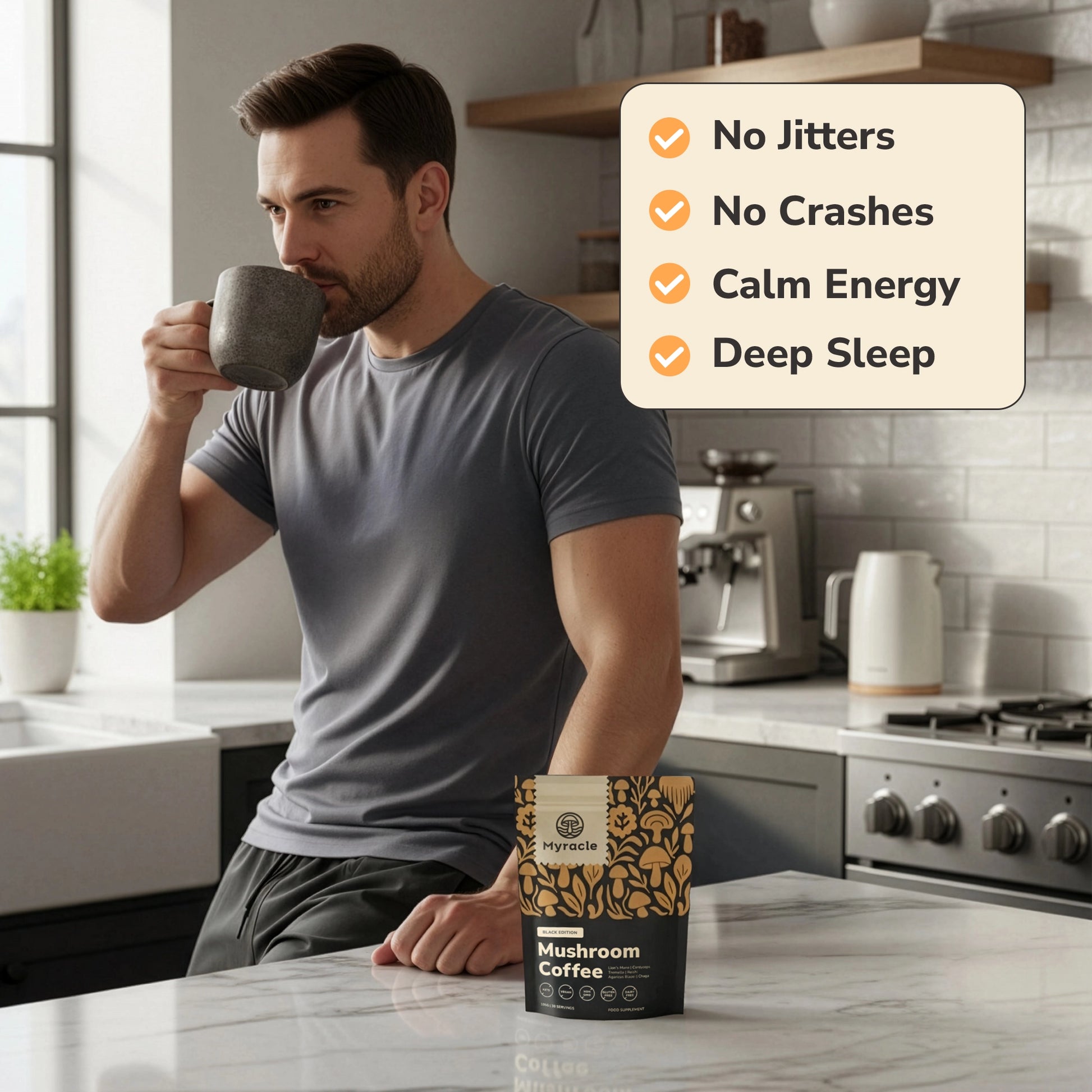 All day energy, focus and mental clarity without the crashes or jitters of regular coffee.