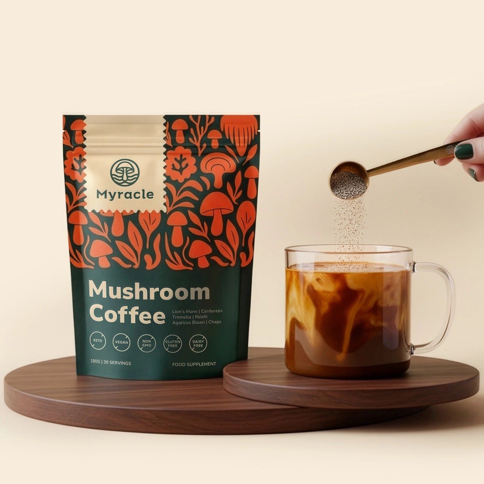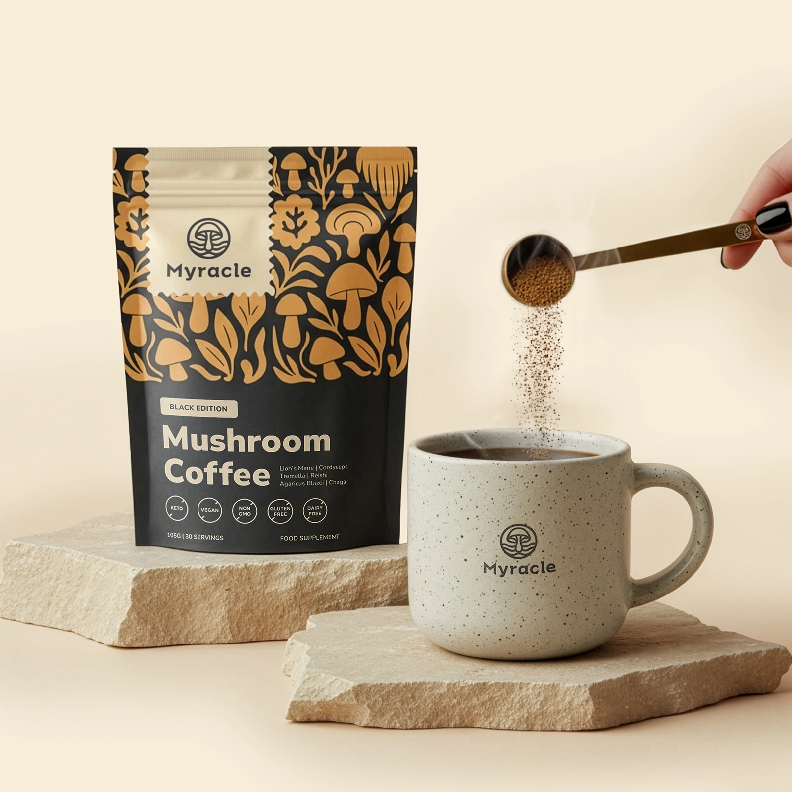 Myracle is crafted to taste indulgent and smooth, all without any noticeable mushroom taste. The Original delivers a creamy, barista-style coffee with a hint of coconut and subtle chocolatey and caramel notes. The Black Edition is a rich, low-acidity Americano with a clean, bold coffee flavour. The Mushroom Chocolate is a velvety, naturally chocolatey hot cacao with a touch of coconut, comforting and satisfying without any added sugar.