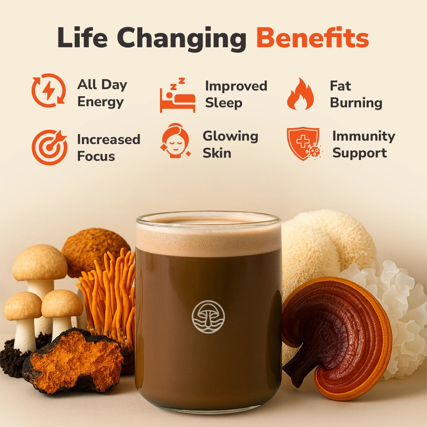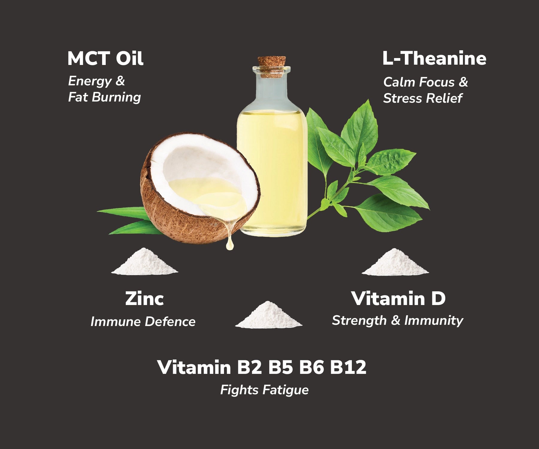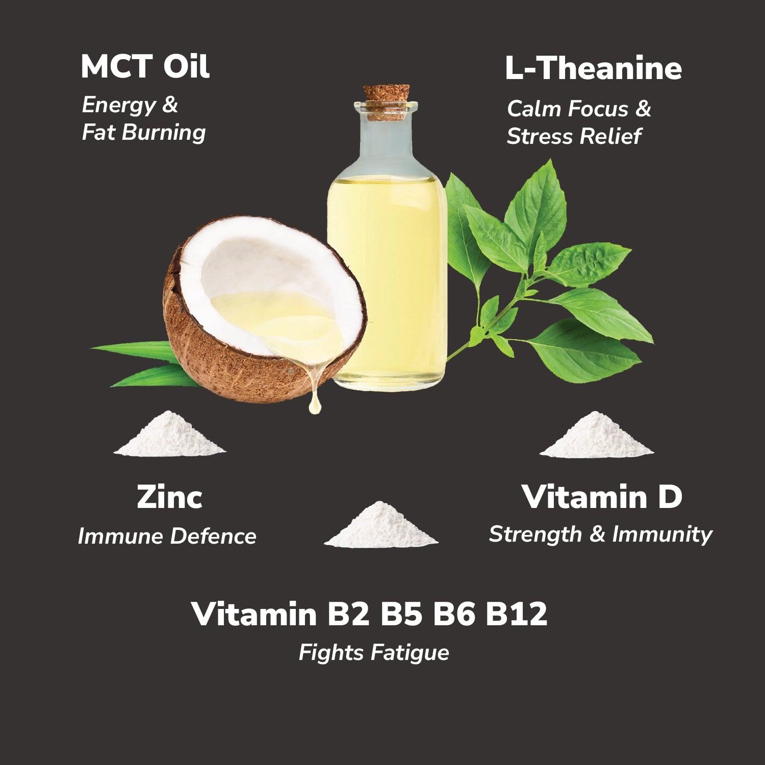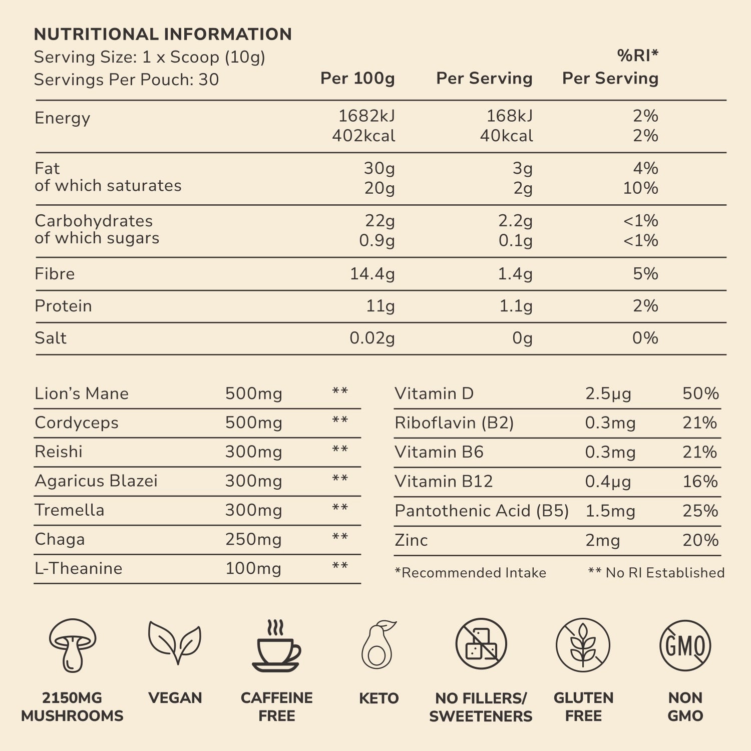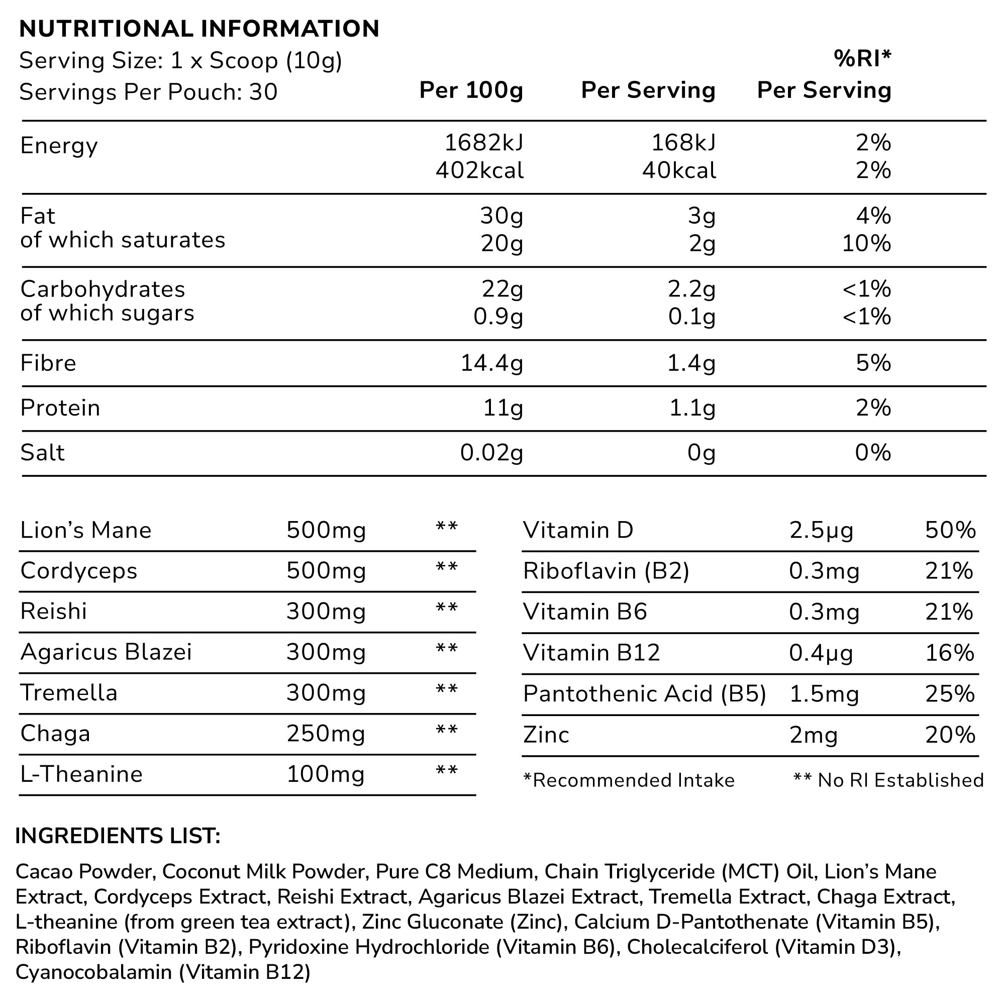 Ingredients: Cacao Powder, Coconut Milk, MCT Oil, Lions Mane, Cordyceps, Reishi, Agaricus Blazei, Chaga, Tremella, L-Theanine, Zinc, Vitamin B5, B2, B6, B12 & Vitamin D