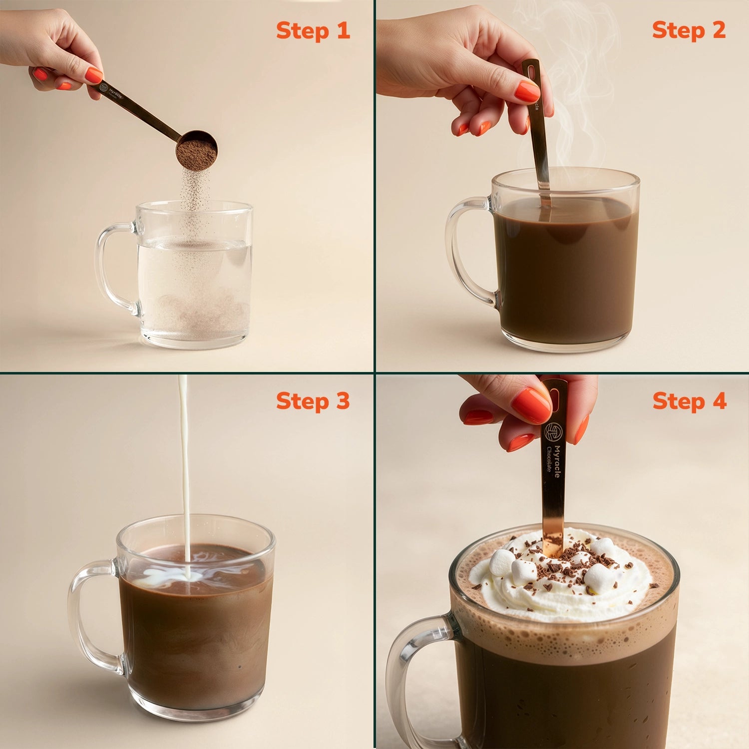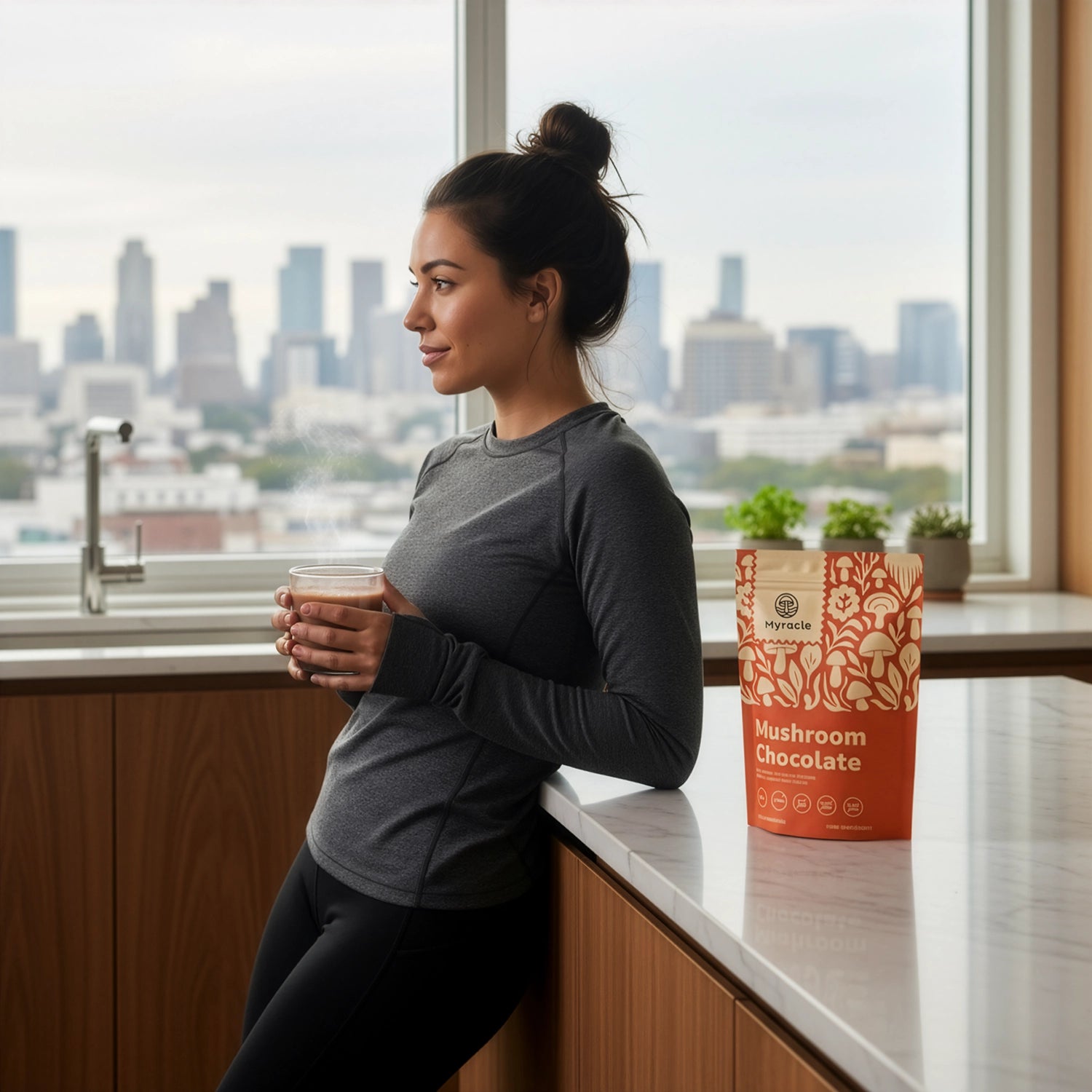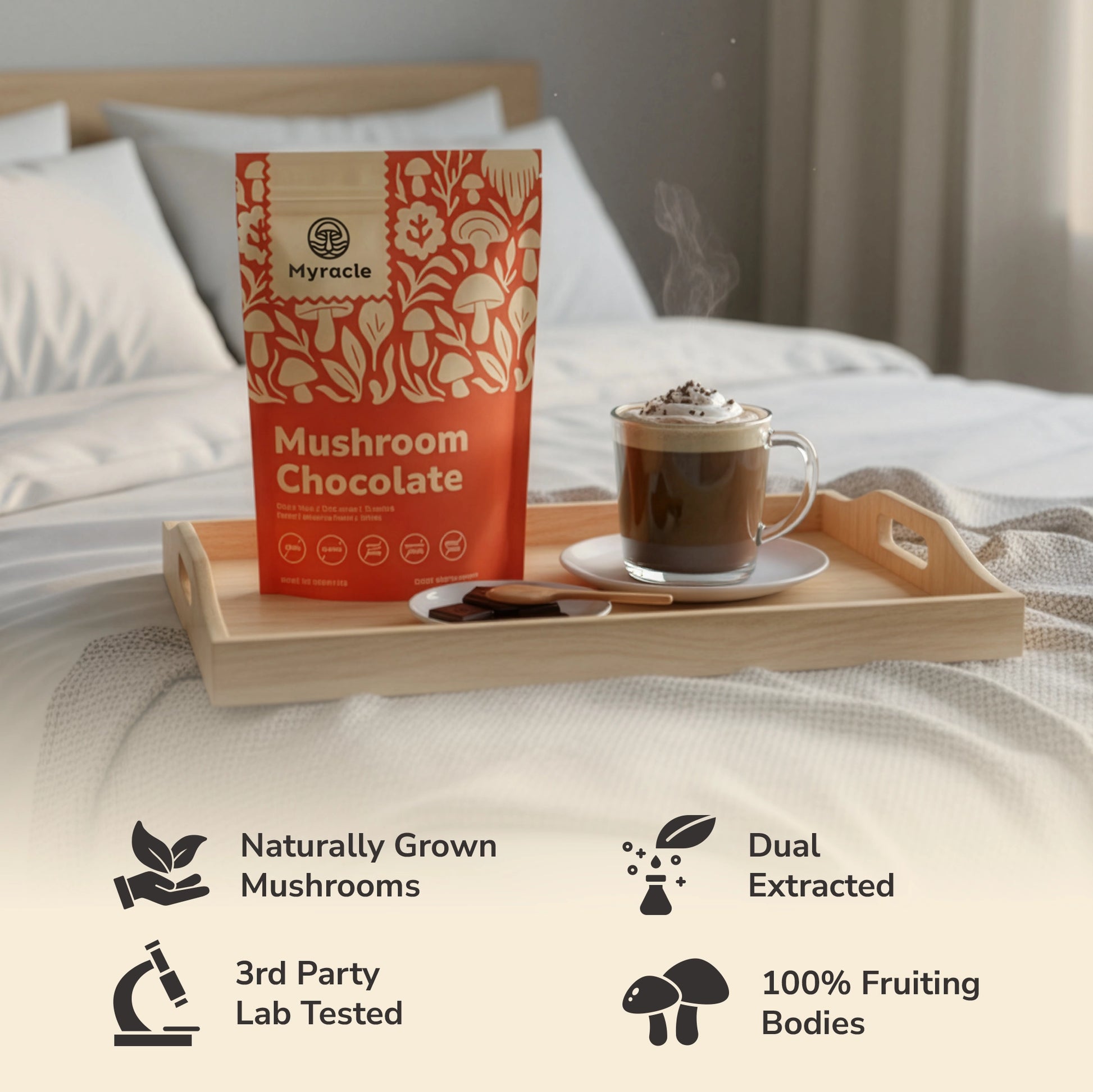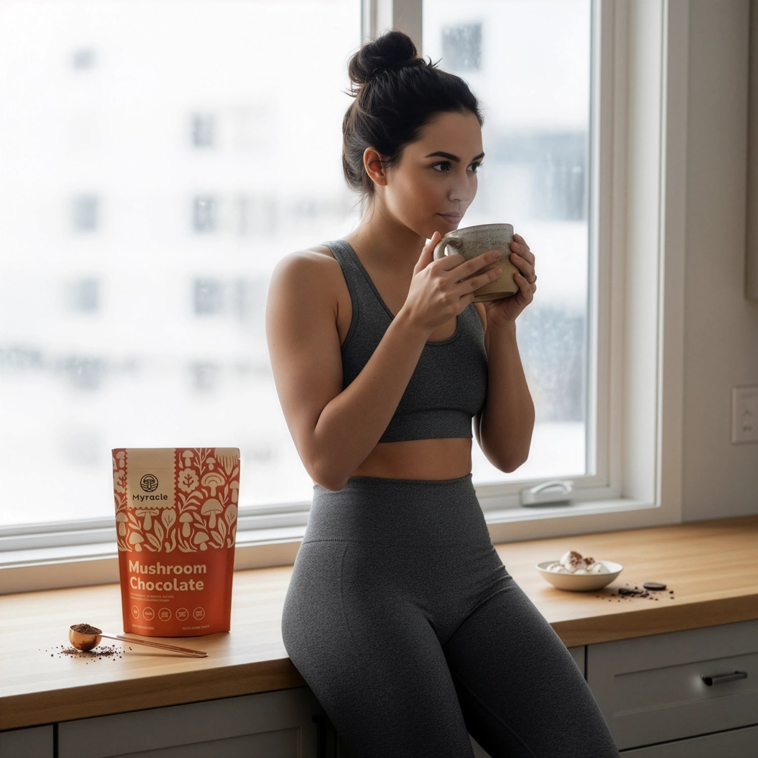 Myracle tastes like a rich, creamy hot chocolate with a hint of coconut. Smooth and velvety from premium, unsweetened cacao, it’s naturally chocolatey, satisfying, and comforting — with no added sugar and absolutely no mushroom taste.