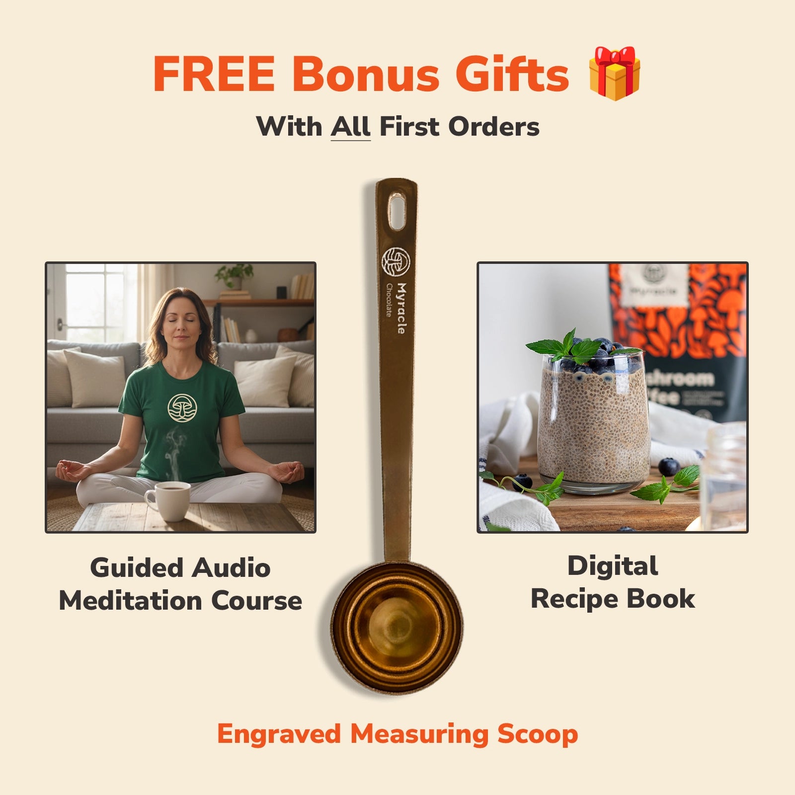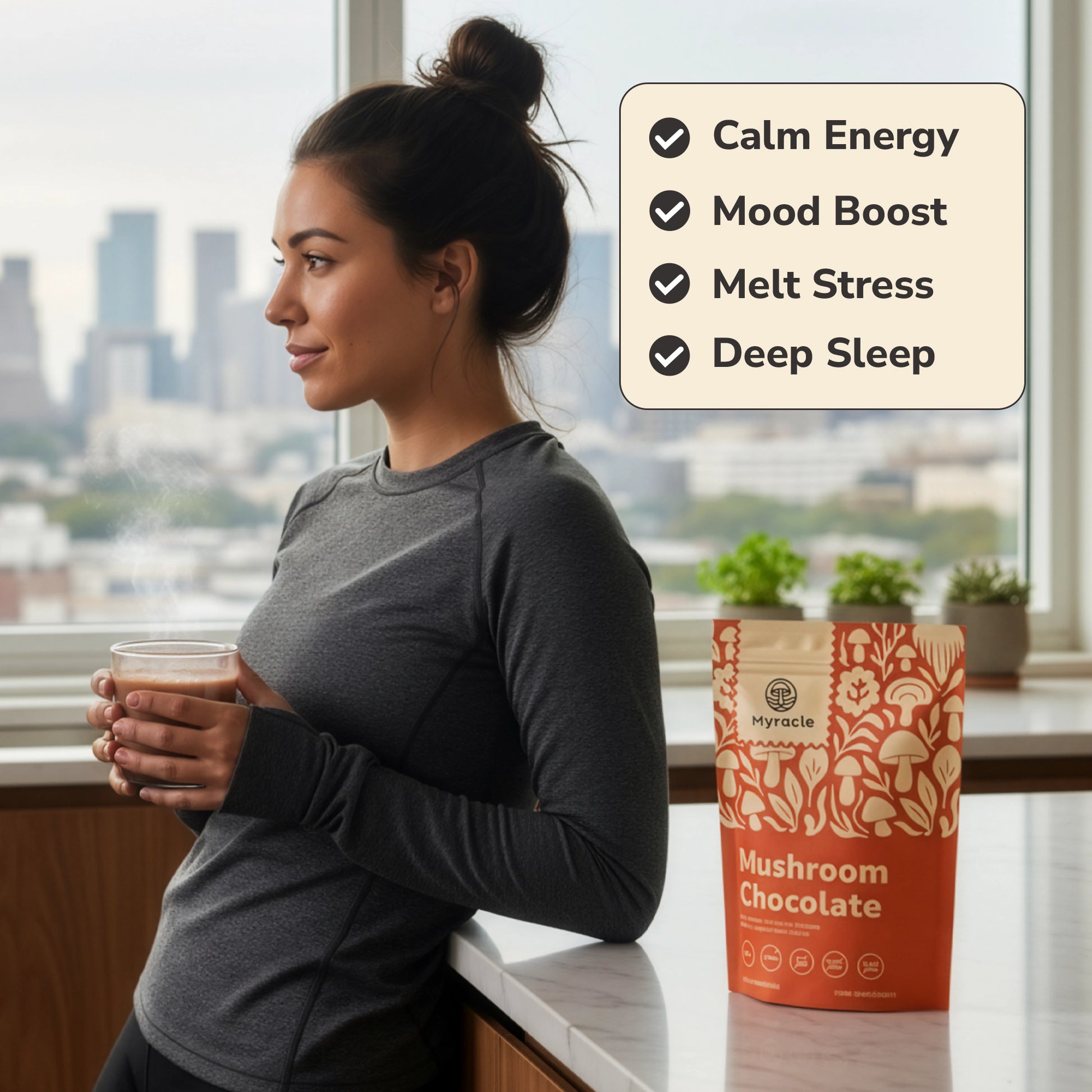 No - Myracle Mushroom Chocolate is completely caffeine-free and contains no coffee. It’s made with premium cacao and the same 6 adaptogenic mushrooms, delivering rich, creamy chocolatey flavor without any coffee taste.